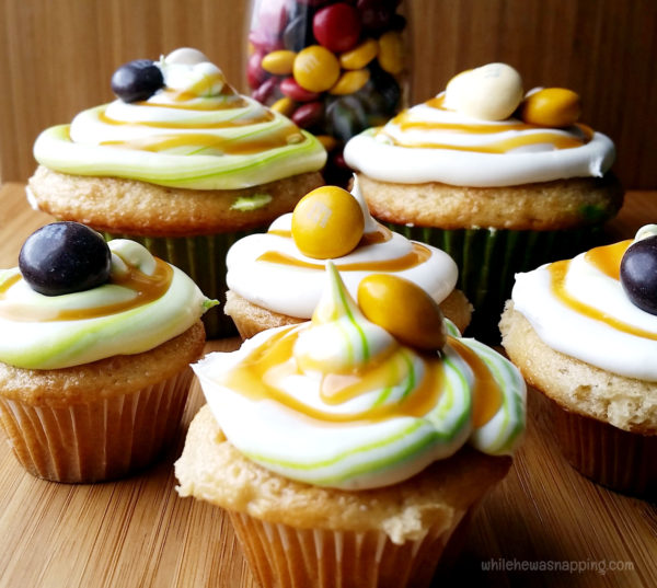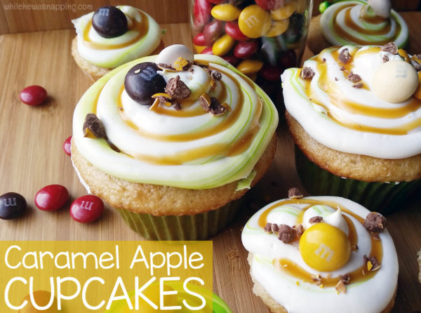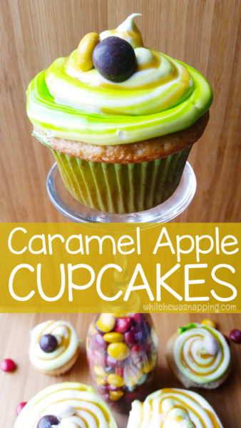 You’ve got the cupcakes, now comes my favorite part of making cupcakes: the decorating!  When I think of caramel apples, I think bright green and that beautiful brown caramel color.  I wanted to put those on display on these cupcakes.  While I was at Walmart the other day, I saw these new M&M’s® I couldn’t pass up – M&M’s® Pecan Pie!  They were perfect with their fall colors to use as a garnish.