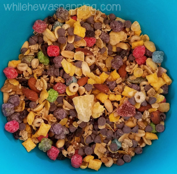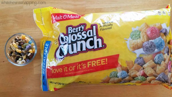 I picked up all the ingredients at Walmart on my last shopping trip. It was a piece of cake to throw this all together and my boys gobbled it up. They loved it… even after the Berry Colossal Crunch cereal and the chocolate chips had all been picked out. Boys…