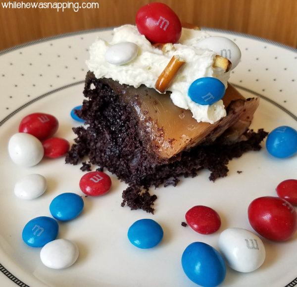 13. Allow to cool completely (2-3 hours). Slice and serve topped with whipped cream, pretzel sticks and M&M's® Red, White & Blue Milk Chocolate for the perfect sweet and salty ode to America.Chocolate Caramel Poke Cake Piece Missing