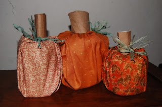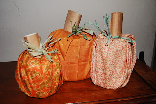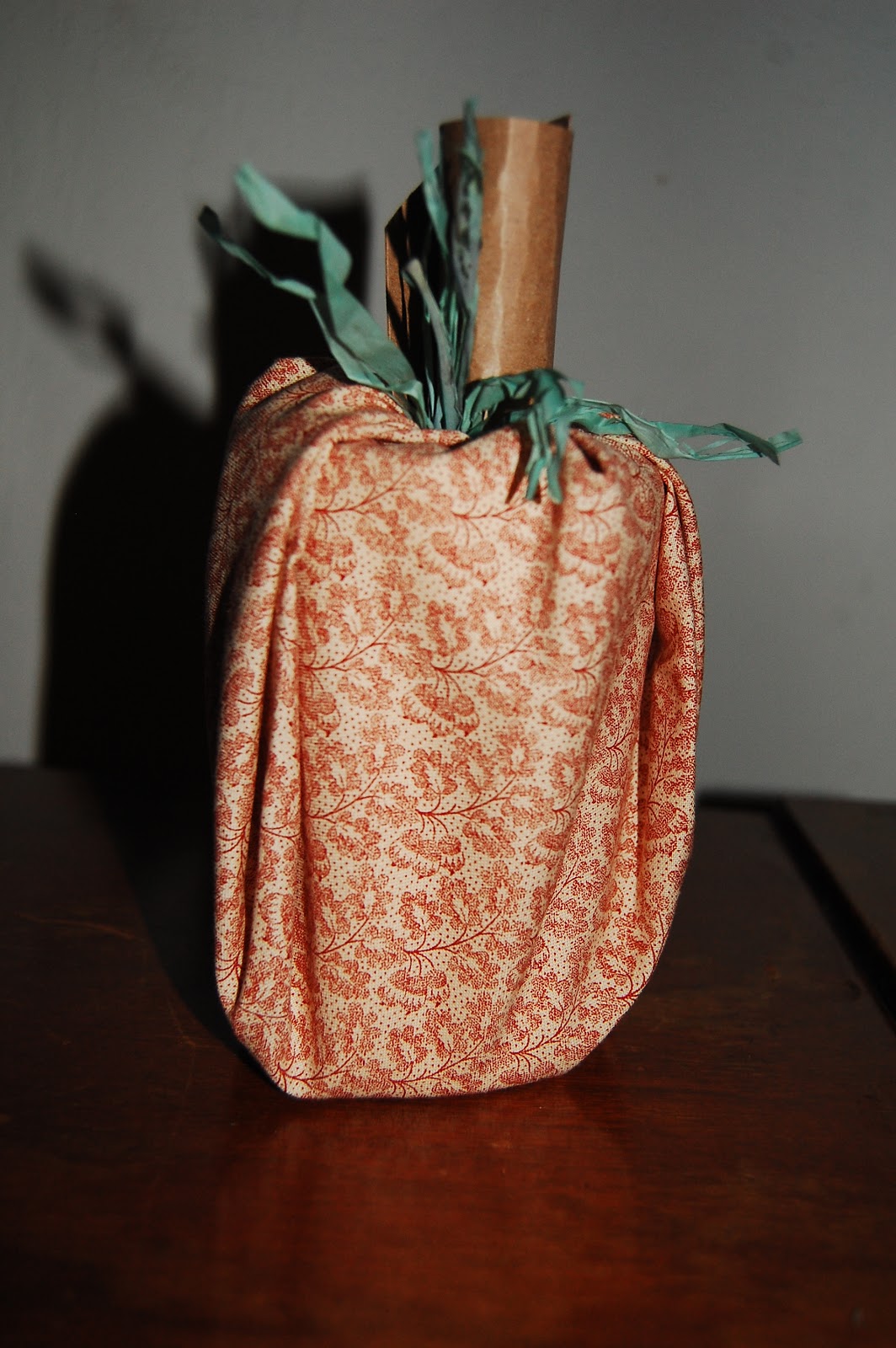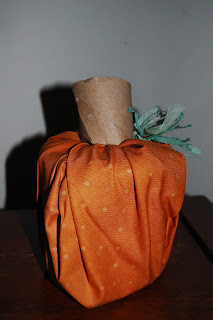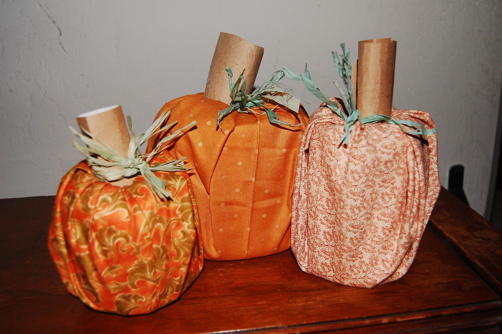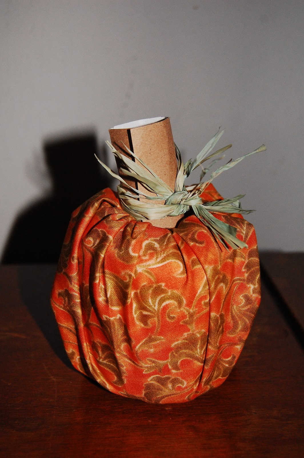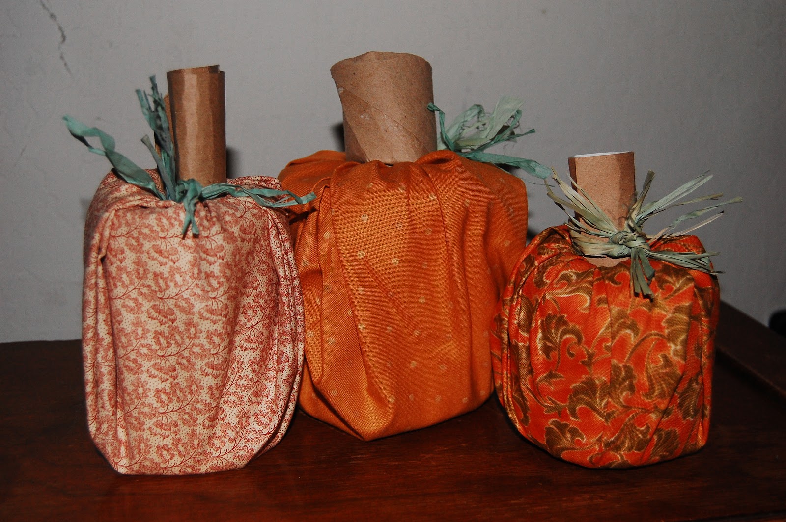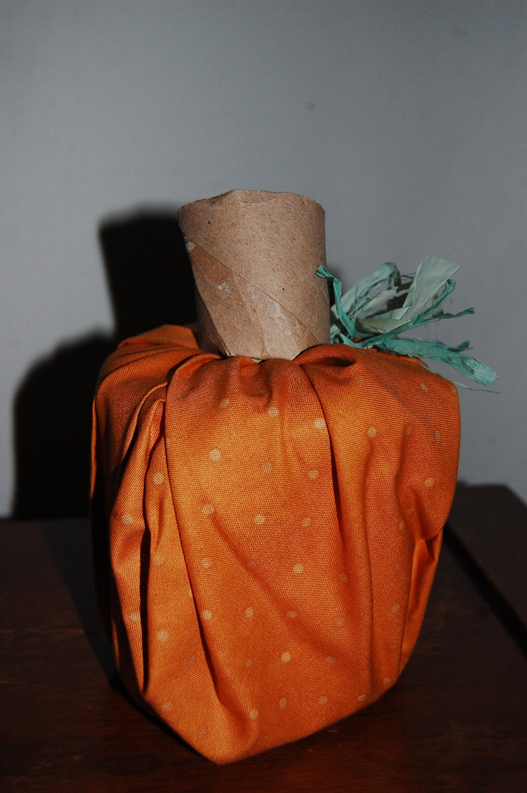 All I did was take some fat quarters, put my TP rolls in the middle, wrap the fabric up around the toilet paper and stuff the ends in the TP tube. Then I took the cardboard that the fat quarters came wrapped around, rolled it up and shoved it in the top. (Actually I did use half of an old TP roll that I saw in the trash – the other half was too squished to use though – on the fattest pumpkin. That’s why the stem kinda goes off at a slight angle.) That box of raffia I got off of Craigslist… yeah, took some of the ginormous pile of green that was in the box and tied it around the cardboard stems. Fluff to perfection. All done! Easy peasy, and oh, so cute!