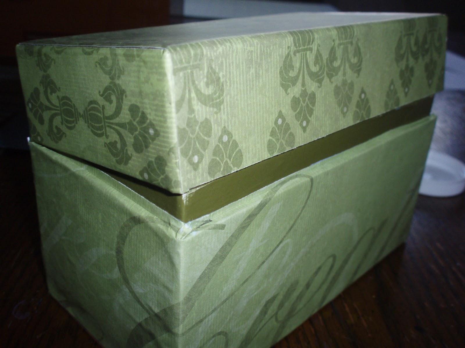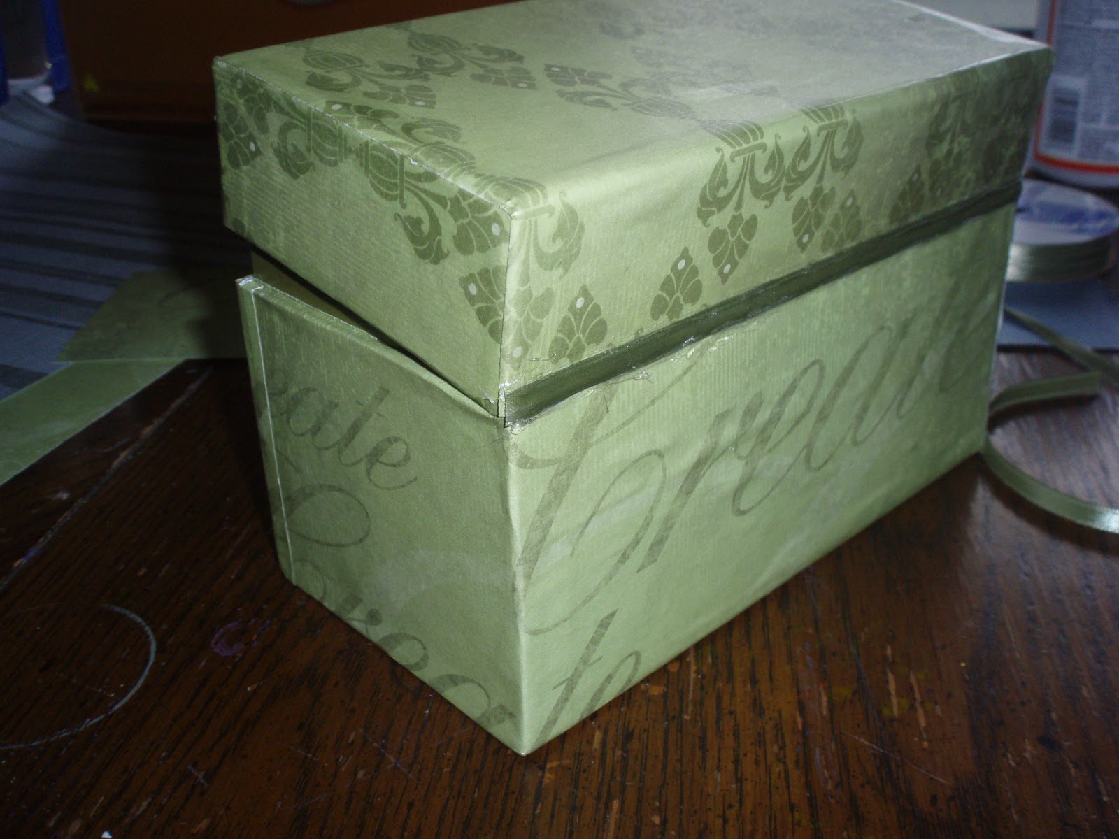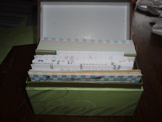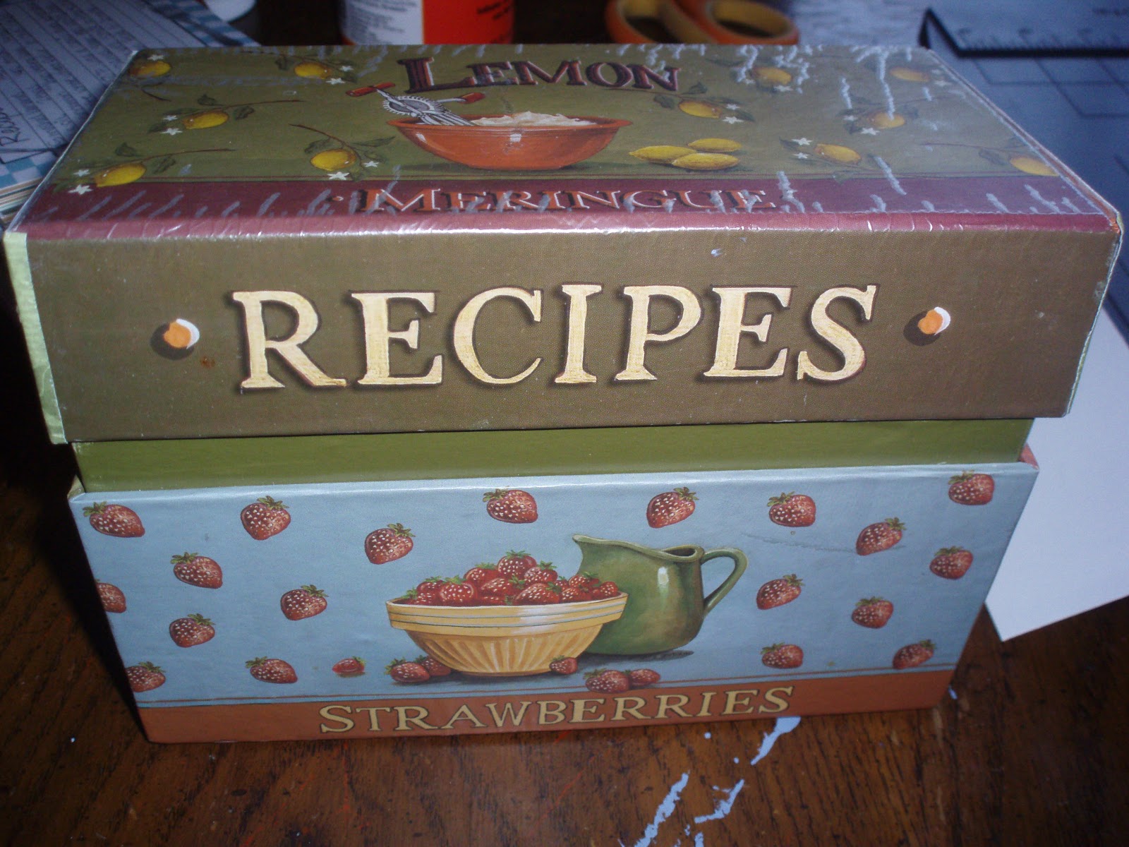 First, take a recipe box. I’m pretty sure you can get these at craft stores. I don’t know a price range. Mine was a gift. See how old and ragged it’s looking…