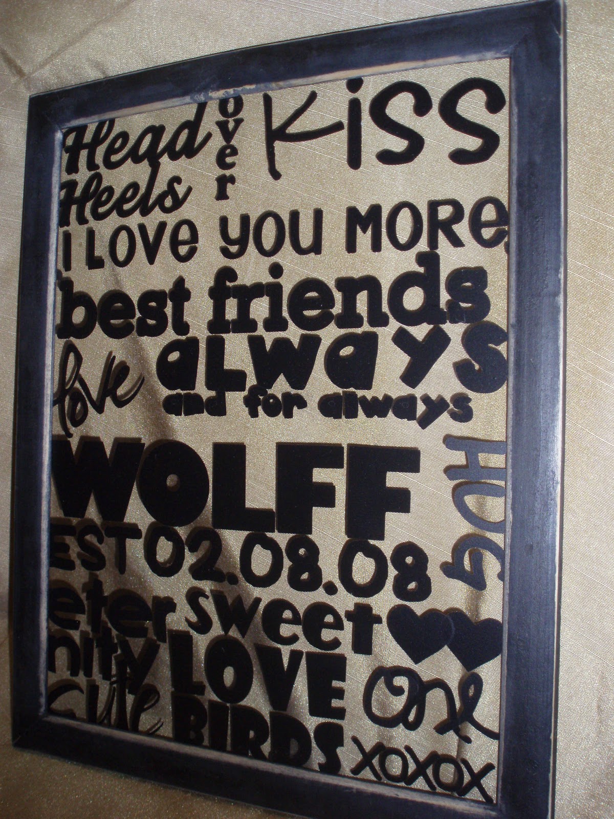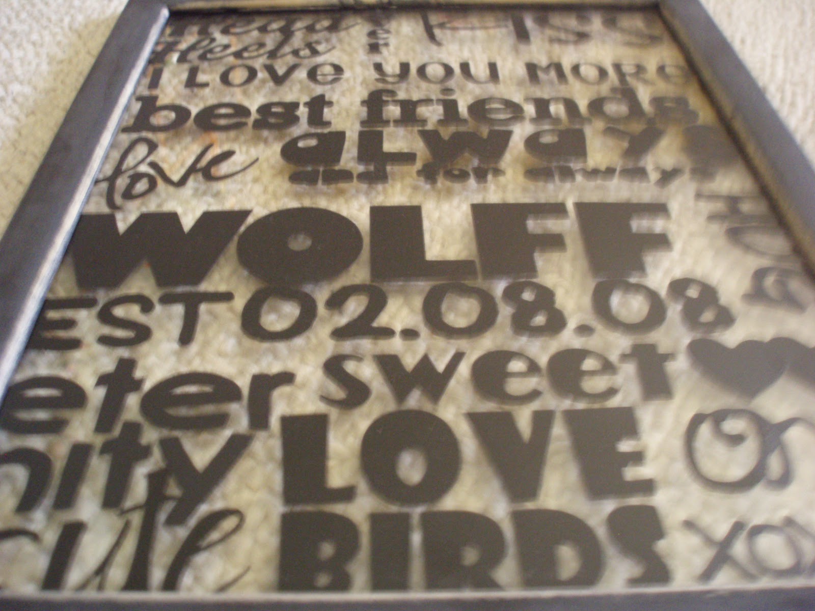 2) You could do this in PhotoShop or paint, with acrylic paints, sharpie markers, print it out on the computer or use vinyl.  The latter is my preferred medium.  You will need to come up with some words or phrases that describe you and your sweetheart.  Pet names, wedding dates, surnames, ect work well.  Arrange your words and phrases as you would like on the glass.