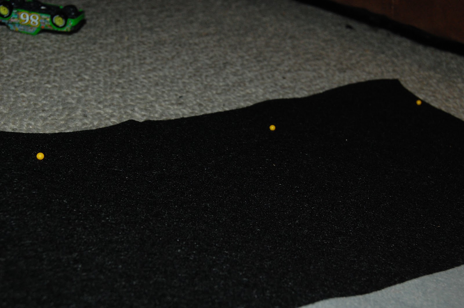 6) After it’s all glued down, grab some cars and test it out. Once you know that it’s a great little play mat, put your little ones down for a nap. Then, when the possibility of someone stepping on or playing with your mat has decreased, grab your yellow puffy paint. Paint lines on your roads. I also added stop signs to some of the roads.