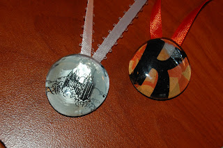 1) You will need a glass stone for each necklace you plan to make, ribbon long enough to slip over your head, some scrap book paper, and stickers or self-adhesive vinyl. I used Tacky Glue to put it all together.