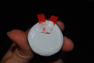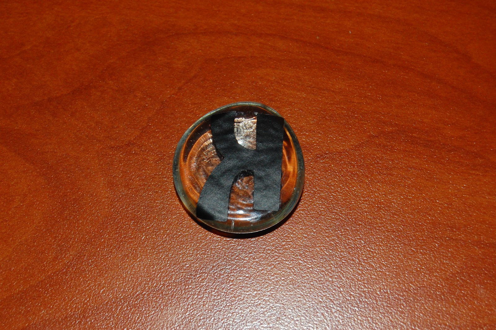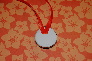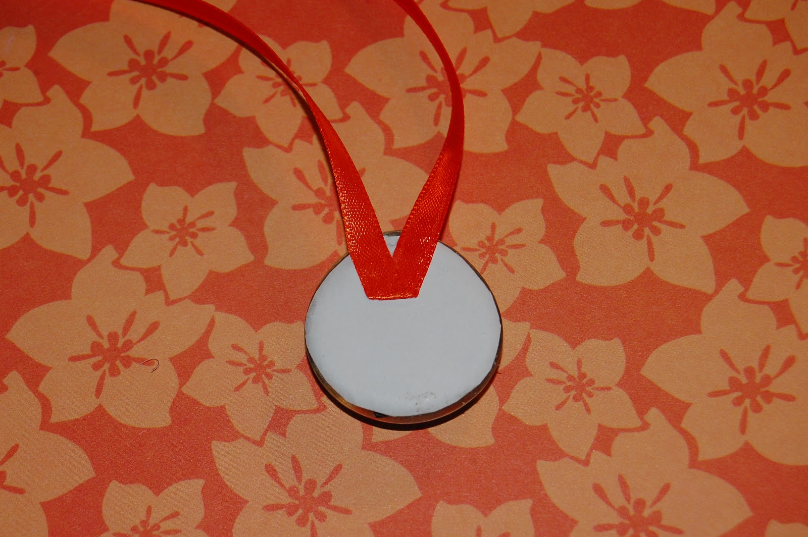4) Glue the ribbon onto the back of the paper. Put a circle of glue around the edges and put your other circle on top of that, with the print facing away from the stone. If you use the sticker, pull the backing off sticker and stick it to your scrap book circle (with the print facing away from the stone. This is different than the vinyl.) Stick your ribbon in between the sticky and the paper to help hold it in place.