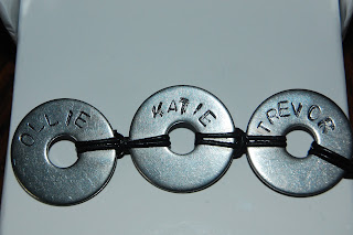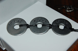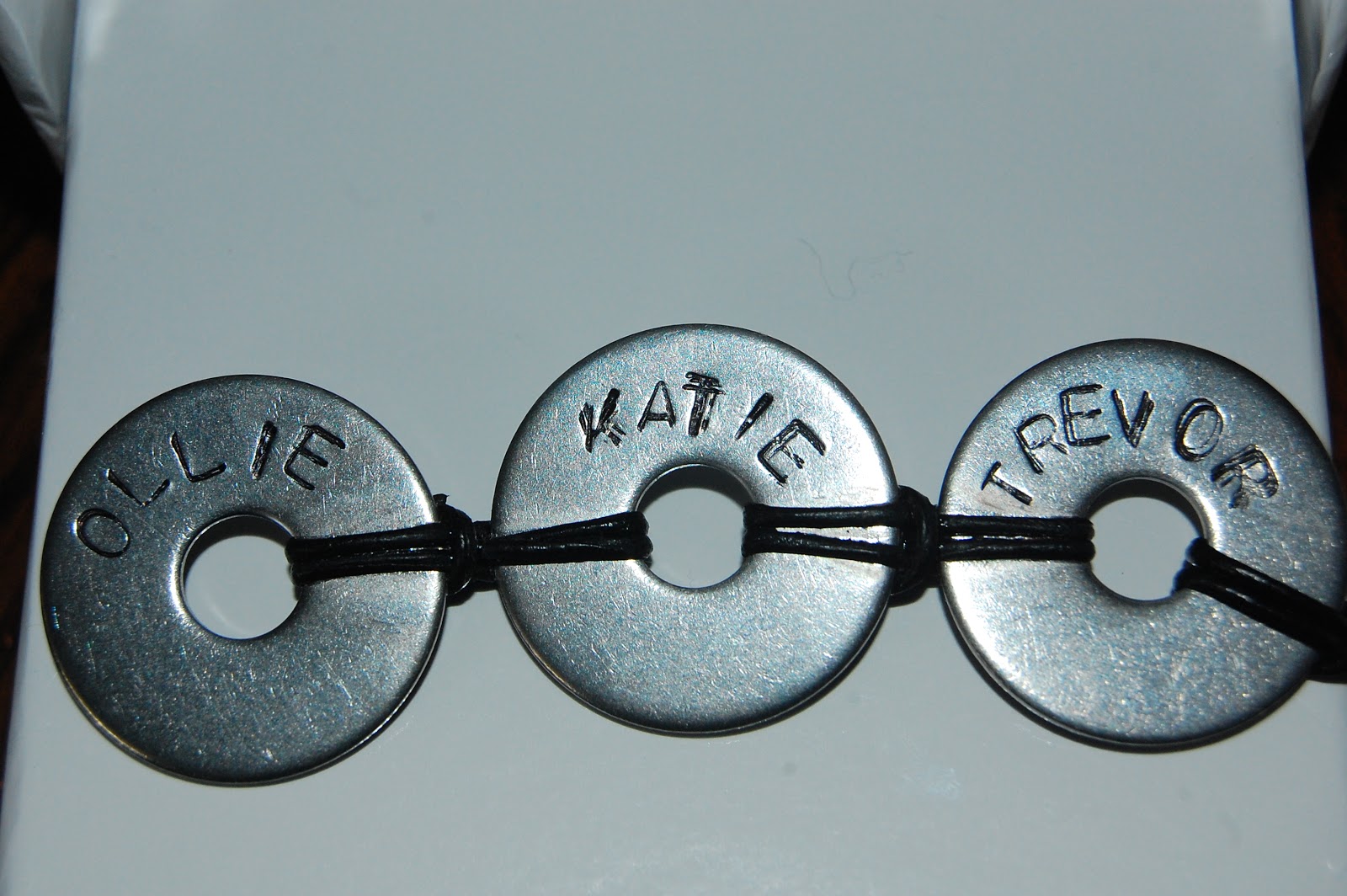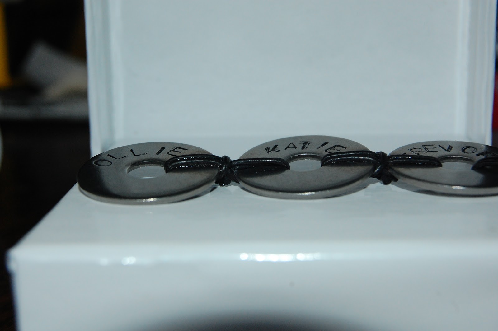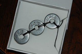 5) After you have your washers stamped, decide how you are going to display them. My Mr Right just slid his washer right on his key chain, easy. The necklace was a little more work. I used a thin strand of leather cord and tied the washers together with a larks head. I used three separate pieces of cord. I tied knots on the back of the washers and then Super Glued them to help them hold. Then I attached a toggle clasp and secured that with some Super Glue and WA-LAH!