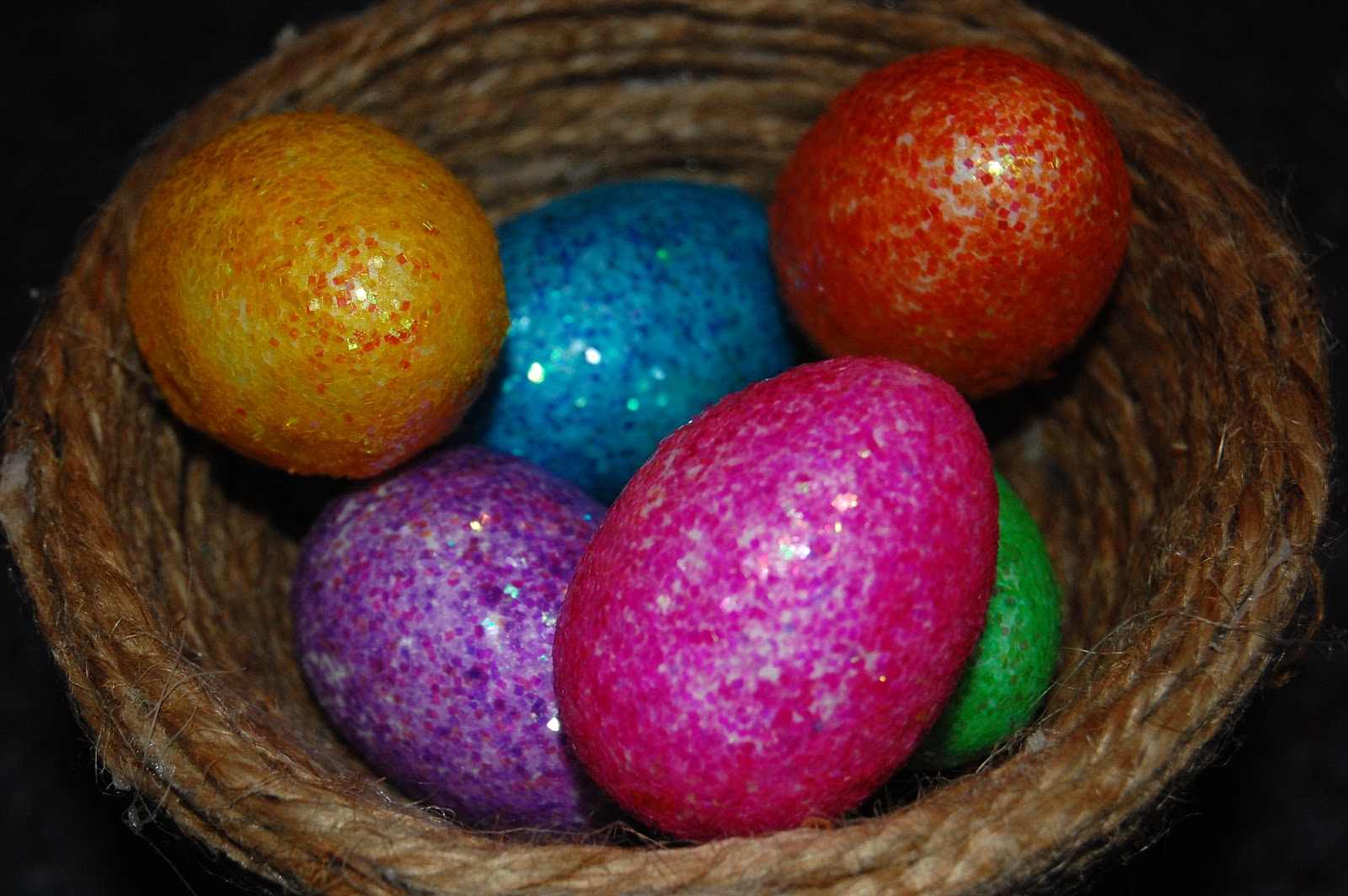 1) I found a set of three little terra cotta pots and a set of 4 glass bowls at the Dollar Tree. At the time, I wasn’t really sure what to do with them, but thought I could figure something out. On a different trip to said Dollar Tree, I also found some glittered eggs with ribbons attached to the bottoms. At first thought, they were going on an egg tree I had in my brain. Then, I started seeing them all over blogland and wanted something a little more original, so they were put on hold til a better idea hit me. I had the jute on hand, as well as the glue gun and glue sticks.