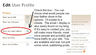 2) Make sure you check the “show my email” box. You have the option of setting which email address you would like to show. The address I have displayed is not the same address as the one I log into Blogger with. You may want to have a separate address solely for your blog. I do, otherwise I’d be totally lost and confused. If you choose to do this, it’s wise to make the address the same as the name of your blog.
