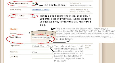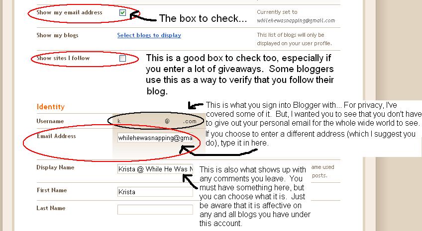 3) Here is where you can set some of the things mentioned above. Click the photo to enlarge. If you want people to see a different email address than the one you use to sign into Blogger enter it in the “Email Address” box. I’ve also pointed out and explained some other options that you might be interested in, such as your display name.