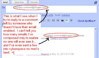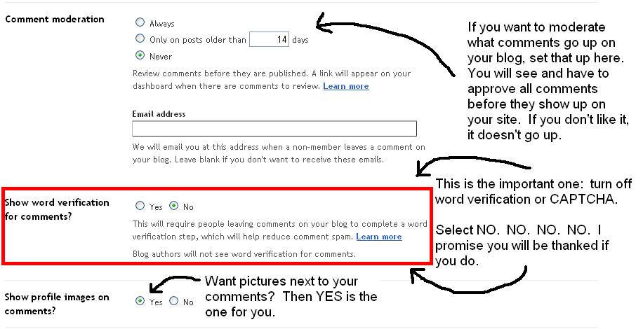 2) CAPTCHA or word verification. Turn it off, please. I promise you will get more comments if you do. Blogger has a pretty good spam filter that catches almost all spam. If you want to monitor comments, turn that feature on. But turn CAPTCHA off. Pah-leeze. Pretty, pretty please. It’s on by default in Blogger, so double check your settings. There’s a full tutorial HERE.
