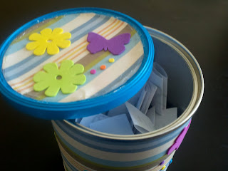 3) Then, they went in an old Similac can that I covered with scrapbook paper. Little Monkey got to help put the foam stickers on after nap time.