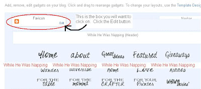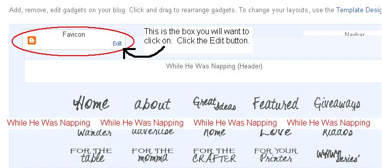 Do you know what a favicon is?  It’s that little image next to the address bar.  Mine is the While He Was Napping logo.  This is actually really, really easy to change to your custom image.  Back when I changed mine I had to copy and paste all the code and put it in the template and everything.  Blogger now lets you change it and makes it super easy.