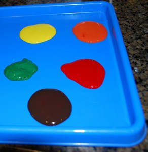Prints are super easy to make. Just squirt some paint on a tray – we used some fun fall colors – but you can change them up depending on the season or your mood. We used five colors here, but I have done 3 in the past and had them work just as well.