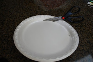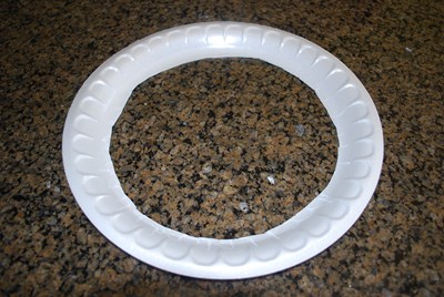 This next part can be done while they are napping. I used a Styrofoam plate that was about 10 inches wide. A large paper plate would work as well. If you don’t have any of these items, you can cut a loop out of some cardboard. Use what you have on hand. You will be cutting the inside of the plate and leaving a ring to use as the base from your wreath.