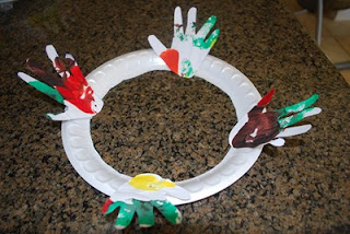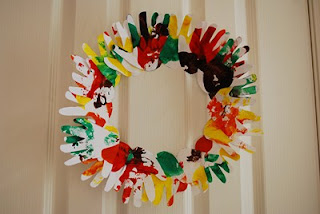 You can see it better here. I love the look of this simple hand print wreath and my kids were so thrilled when they woke up and saw what I had made with their artwork.