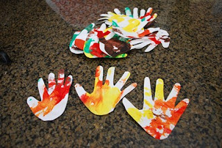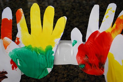 Hello While He Was Napping readers! I am super excited to be here today! I am Vicky, and at Mess For Less, I blog about kids crafts, activities and games with an emphasis on budget friendly fun. I am a former Preschool and Kindergarten teacher and now a mom of three kids all age 3 and under. I like to keep them busy with various creative and educational activities (less time for them to fight). One of our favorite things to do is paint. With the weather turning cooler we were inspired to make some Fall prints. What I love about these prints is that they are simple but can be used to make some more elaborate crafts like the Hand print Wreath I will be sharing later in this tutorial.