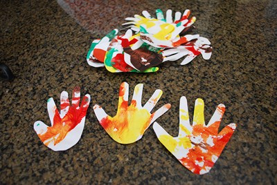 For the next part of this project your prints will need to be dry. The next day when ours had dried, I used a pencil to trace the kids handprints onto our Fall prints. I don’t have any pictures of this step since I was doing the tracing and I am also the photographer. Hey, I’m a one woman show! So the littlest one was not into having her hand traced. As soon as I started tracing her hand, she started screaming and crying and carried on for a good 20 minutes. So I only used my older daughters hand prints. After you trace you child’s hand prints, you can cut them out. I ended up with 22 handprints. I think as long as you have around 20, you’ll be fine.