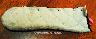 1) Take your mitt and cut it down to fit your iron. I used a mitt, cut the thumb off and thinned it down a little. You could definitely do this with a hot pad too. Just fold it in half and sew the top and side together. Just make sure you leave enough seam allowance for your iron to fit in the mitt once you sew up the open edge.