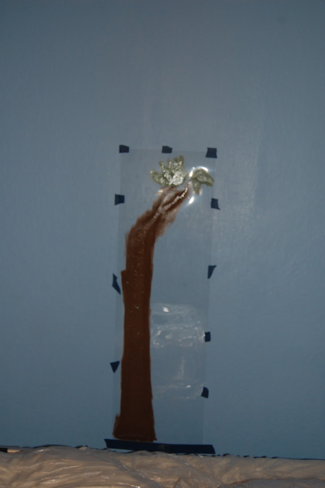 The first part of the stencil was super easy to put up and paint. It’s suggested to use a paint roller, which i did for the tree trunk. I ended up using a sponge brush for the smaller branches and leaves though so I had better control over what colors went where. After I did the first part, I made my mom wait for 15 minutes so the paint wouldn’t drip or leak. Apparently, that’s where I get my patience from (or lack thereof).