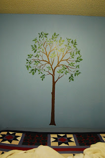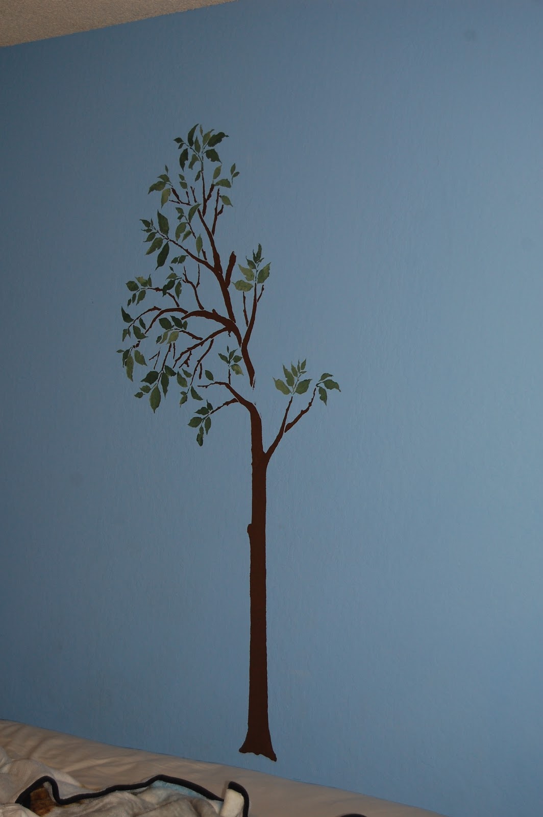After the crazy died down, we set aside a day and planned to get this tree on the wall. We used Valspar paint samples from Lowe’s. My mom chose a brown for the tree trunk and branches and two shades of green for the leaves. The paint samples were more than enough to cover the entire stencil. And we spent most of our day trying to decide on which colors. My mom is a little OCD and indecisive… not a productive combination.