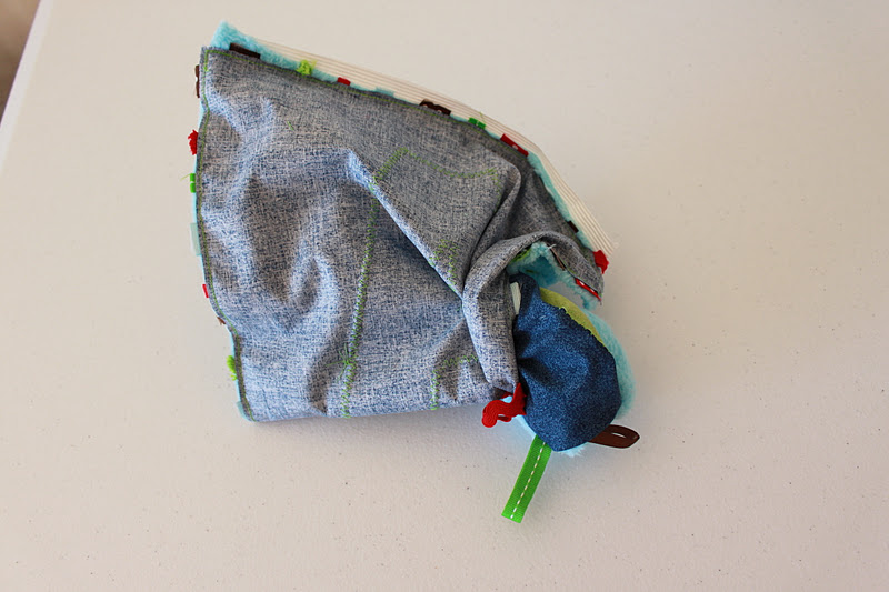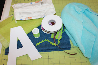 Now, using your zigzag stitch, stitch all along the outside of your lovey.  I like to start on the side with my gap so I can take care of that right off.  Simply fold in your fabric, ribbons, and soft material and zigzag stitch over the opening.  I like using a zigzag stitch here for a variety of reasons.  It ties in the color of your letter, it reinforces your ribbons, and it adds an element of fun to your lovey.