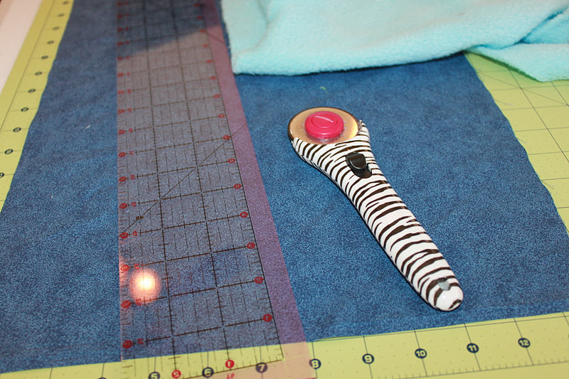 Iron your cotton fabrics.  Cut your large background piece and fleece piece to 11″ x 11″.  I like to use my cutting board and rottary cutter, but scissors work just as well.
