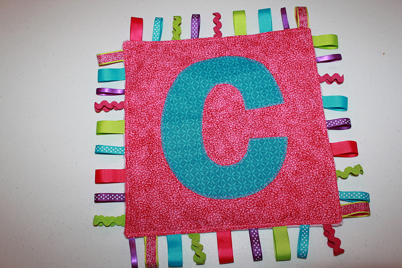 Hi!!  I am Beth from 19elephants.  I am so excited to share with you my tutorial for a Personalized Taggie Lovey.  I made my first taggie lovey when my daughter was 4 months old.  She LOVED playing with and chewing on the tags on her toys.  I had seen taggie lovies before, so I decided to try to make one.  I couldn’t resist adding a personal touch and putting my daughter’s initial on her lovey.