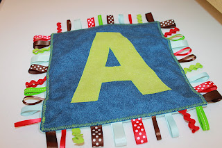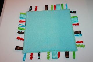 She still loves to play with it, and I have enjoyed making more taggie lovies for baby gifts.  I always like to give a gift that is handmade, and I love that this is a gift that the new baby can use early in life.  I also love this project because you can put so many personal touches on it, and the possibilities for color choices are endless.  You can also use as many or as few different colors and kinds of ribbon as you want.  This is my first tutorial, so I hope it is easy to understand, and that you have as much fun making your taggie lovey as I did making mine!