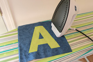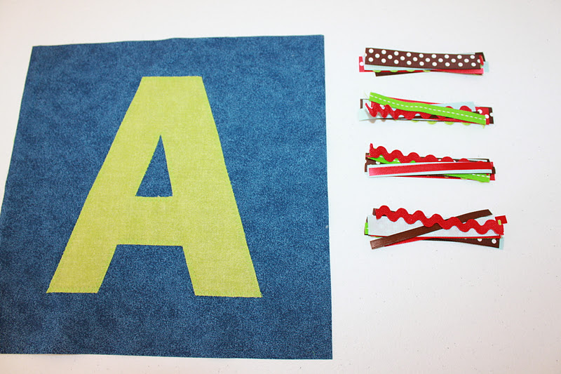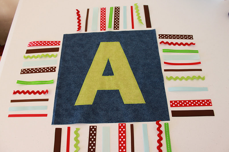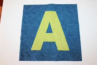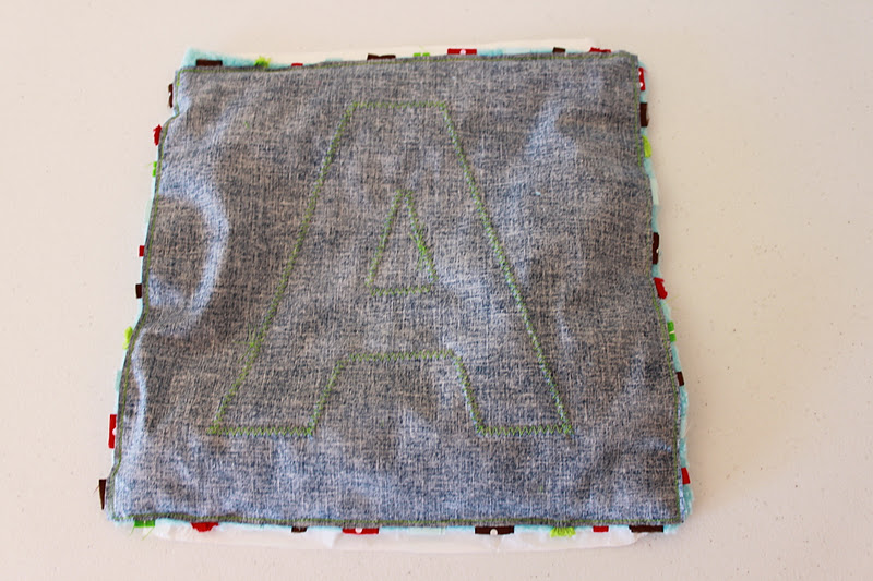 Using your stencil that you have made, trace your letter on the BACK side of your smaller piece of fabric.  **Make sure that you trace your letter backwards, so it will be correct on the right side of your fabric.  This is not as important when using a letter “A” like I did, but this is obviously very important when using a letter like “B.”  I simply held down my stencil, traced around with a pen, and then cut it out.  Place your letter on your square of fabric where you want it and pin it down.  I like to place my pins in the middle of the letter, so I don’t have to worry about removing them while I sew down my letter.