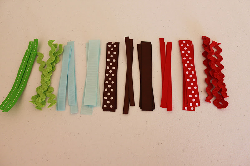 There are endless possibilities when choosing your ribbon.  I always have a lot of ribbon on hand because I also make hair bows, but this project can be done with two, or ten different kinds of ribbon.  I like to use a variety of textures and sizes so the baby will have lots of different ribbons to feel.  For this lovey I have chosen ricrac, satin ribbon in two different sizes, and grosgrain ribbon in two different sizes.  I like to have a lot of ribbon on my lovies, but you can use as few or as many pieces as you would like.  I used ten different kinds of ribbons in four different colors, and I needed four of each kind, so I cut 40 pieces of ribbon in all.  Cut your ribbon in 4″ pieces.