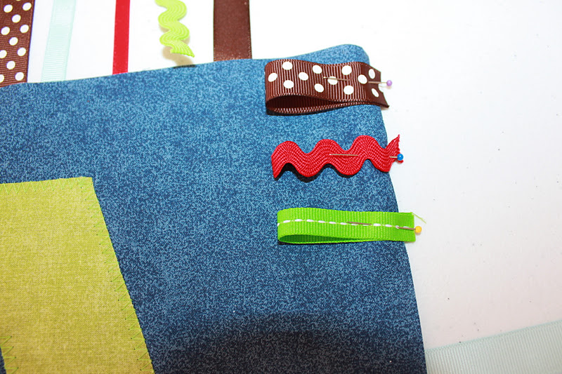 If you’re like me, and you’re not someone who thrives on orderly things (I wish I was more Type A, and I’m sure my husband does too!!), you might want to skip pinning your ribbon.  I put my ribbon in stacks in the order I want to sew them on my project.