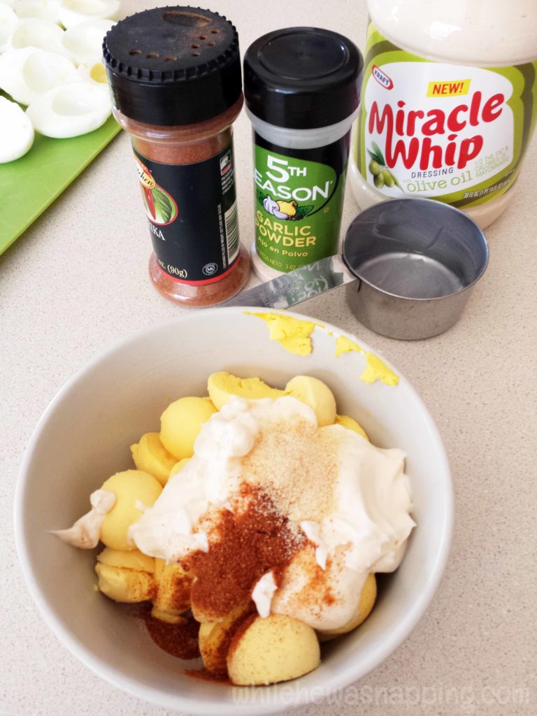 - In the bowl of egg yolks, combine the garlic powder, the paprika and the Miracle Whip.