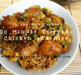 For example, I do 2 cups of dry rice for my little family. This means I will need 4 cups of liquid. I should have almost a cup of teriyaki sauce mixed in my bowl. I will then need approximately 3 more cups of water. If you want a stronger teriyaki flavor simply increase the amount of sauce you prepare and decrease the extra waterm accordingly. Pour the teriyaki sauce in the rice cooker. Add the extra water. Dice the chicken and dump it in the cooker as well. Set the cooker to cook and walk away. Serve when the switch flips from “cook” to “warm”, at least that’s what mine does. I usually serve it with steamed veggies (that I cook in my Pampered Chef steamer) or mix the veggies right in.. Super simple and prep time is like ten minutes max.